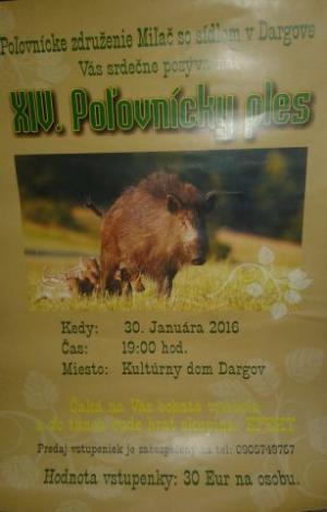 Poľovnícke združenie Miľač Dargov Vás pozýva na Poľovnícky ples, ktorý sa bude konať dňa 30.01.2016 o 19.00 hod. v priestoroch Kultúrneho domu Dargov.