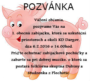 Srdečne Vás pozývame na 1. obecnú zabíjačku, ktorá sa uskutoční v priestoroch a okolí KD Dargov, dňa 6.2.2016, so začiatkom o 7.00 hod.