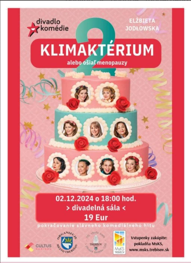 Mesto Trebišov, v spolupráci s Mestským kultúrnym strediskom Vás pozývajú na divadelný hit Klimaktérium 2, alebo ošiaľ menopauzy do divadelnej sály MsKS, 2. decembra 2024 o 18:00.