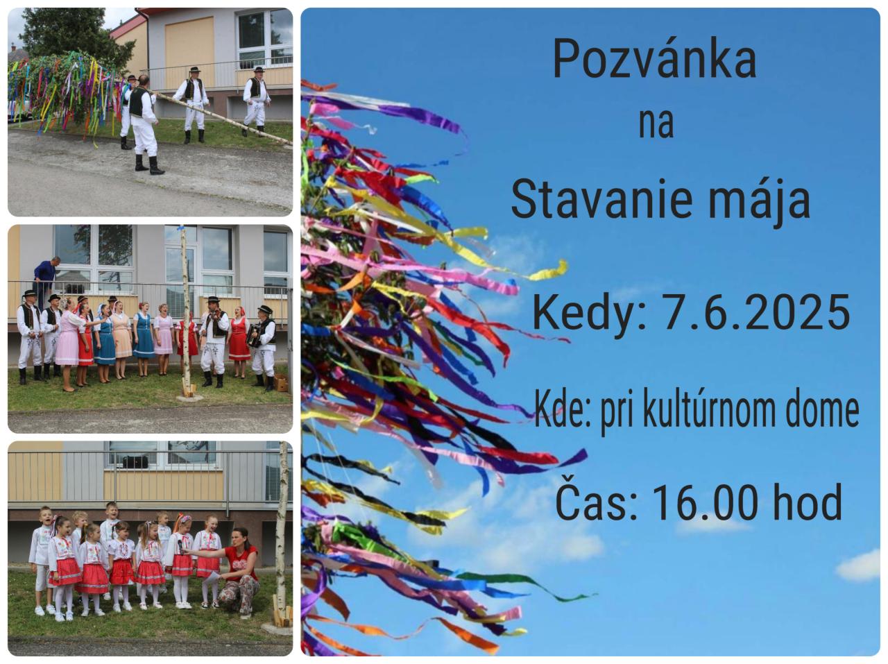 Srdečne pozývame všetkých na stavanie mája, ktoré sa uskutoční v sobotu 7.6.2025 o 16.00 hod.